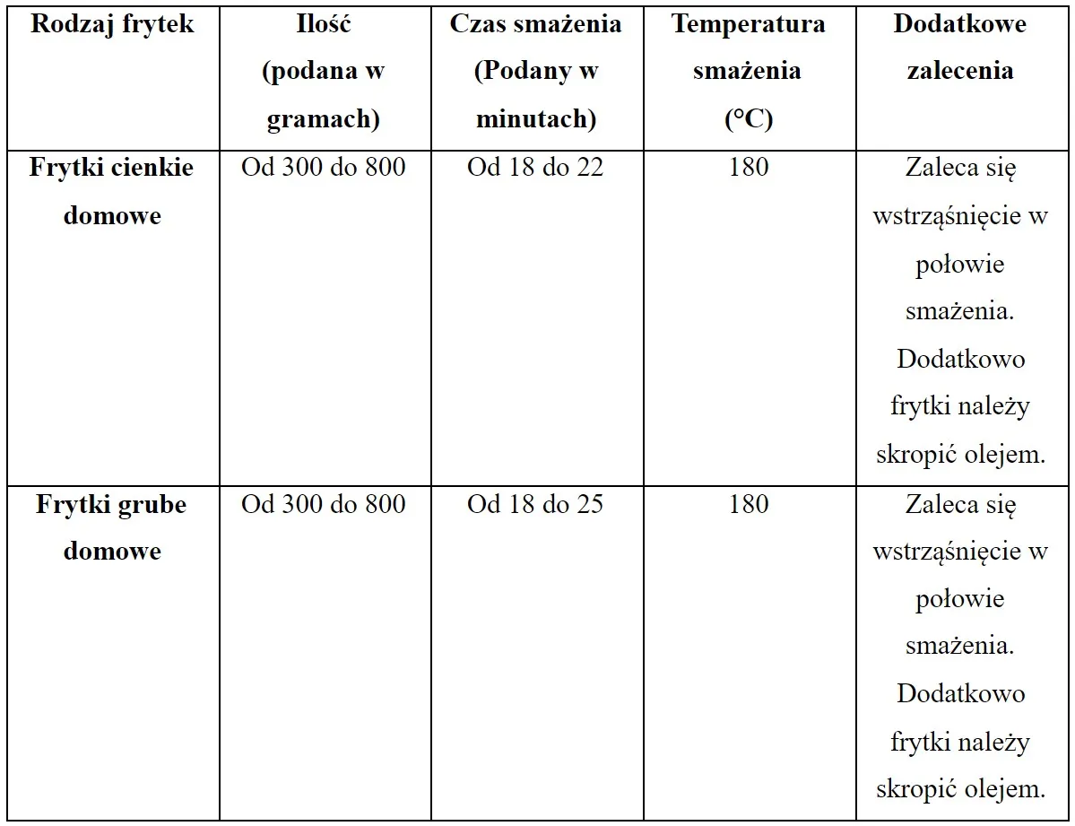 - W frytkownicach beztłuszczowych temperatura wynosi 180-200°C, czas smażenia 15-20 minut.