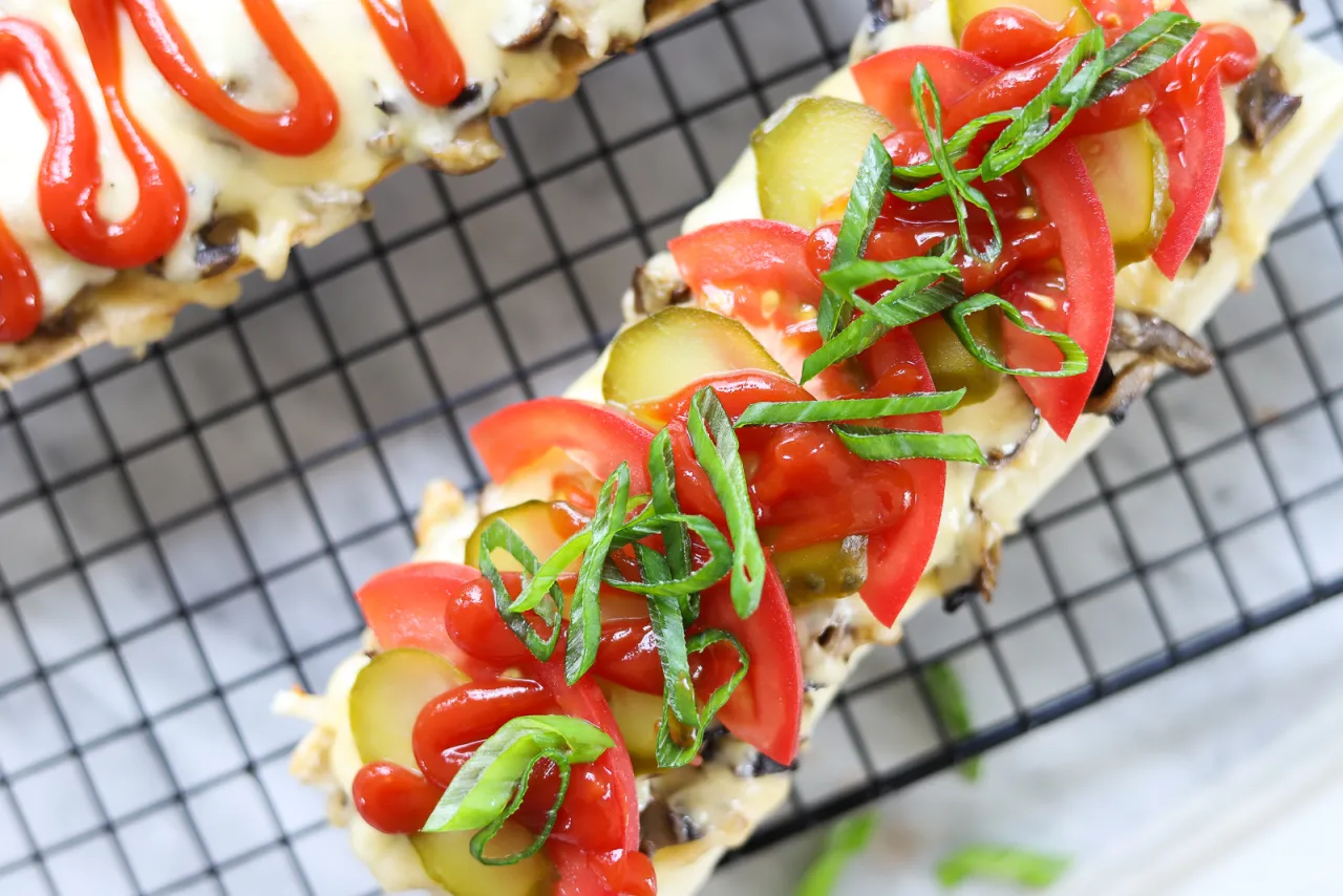 Po upieczeniu, wyjmij zapiekanki z piekarnika i natychmiast polej je ketchupem w formie zygzaka. Podawaj na gorąco, aby cieszyć się pełnią smaku.