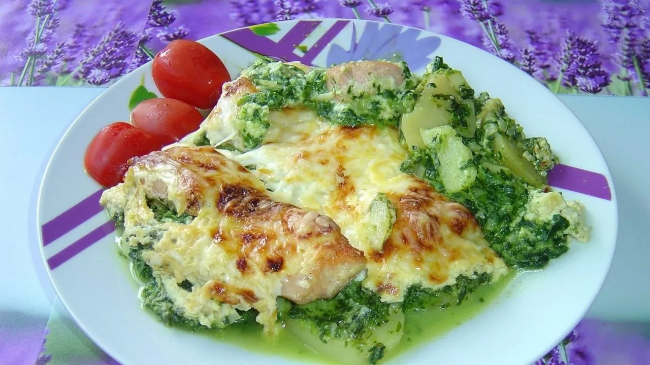 - Kluczowe składniki to filet z łososia, świeży szpinak, śmietana oraz ser żółty.